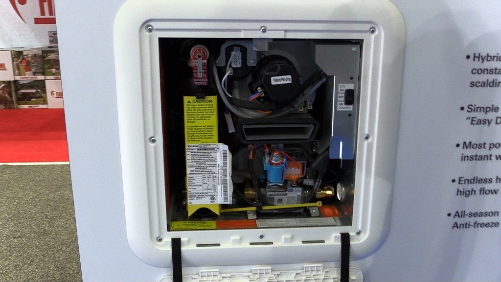 The AquaGo is Truma's tankless water heater. It's an instant, on-demand system. Many manufacturers offer tankless water heaters these days, but the Truma is different. It's what they call a "hybrid" tankless water heater -- which means, it has a small tank.