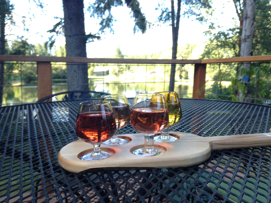 The setting offered a flavor of the Northwest--literally--in the form of a nightly wine bar offering a tasting of regional vintages--Ste. Chapelle Soft Huckleberry, Maryhill Pinot Gris, Mica Peak Cabernet Sauvignon. So we sat on the deck overlooking the lake and sipped in the scene.