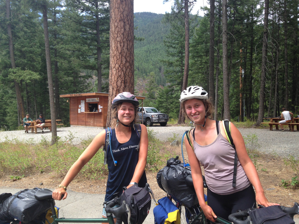 The two young women below are Meredith and Kate, recent graduates of Vermont's Middlebury College. The interaction began when Kate asked if I was part of the movie production team (she must have mistaken me for Leo D--happens all the time). But then we got to talking. And we discovered that they, along with Kate's boyfriend, have been traveling cross-country on two wheels.