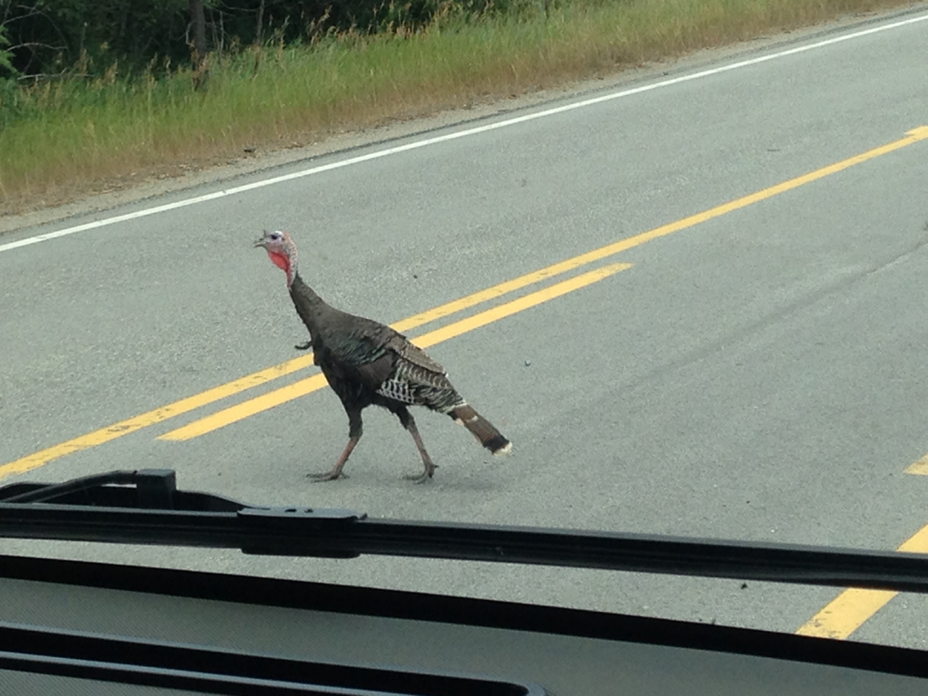 Sure, we were heading to Glacier NP--where bighorn sheep and grizzlies abound. But unexpected wildlife, even when it's not in the wild, feels... somehow wilder. Later in the afternoon (although I don't have a photo to prove it) a black bear scurried across U.S. 2 a quarter-mile in front of us. But not long after Newport, as we were passing through Priest River, Idaho, this fellow below stopped traffic. Why did the turkey cross the road? We'll never know.