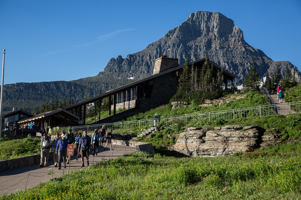People walking outside the Logan Pass visitor center built into the side of a small hill with towering rock formation in the background.The Logan Pass visitor center is the pinnacle of the bus shuttle through the park and where we transferred buses.