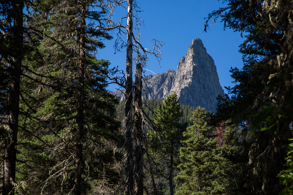 Massive rock formation peaking out over the tops of trees.This monolith stood sentry over us as we anxiously crossed through the brushy desolate area and discovered the bear scat.