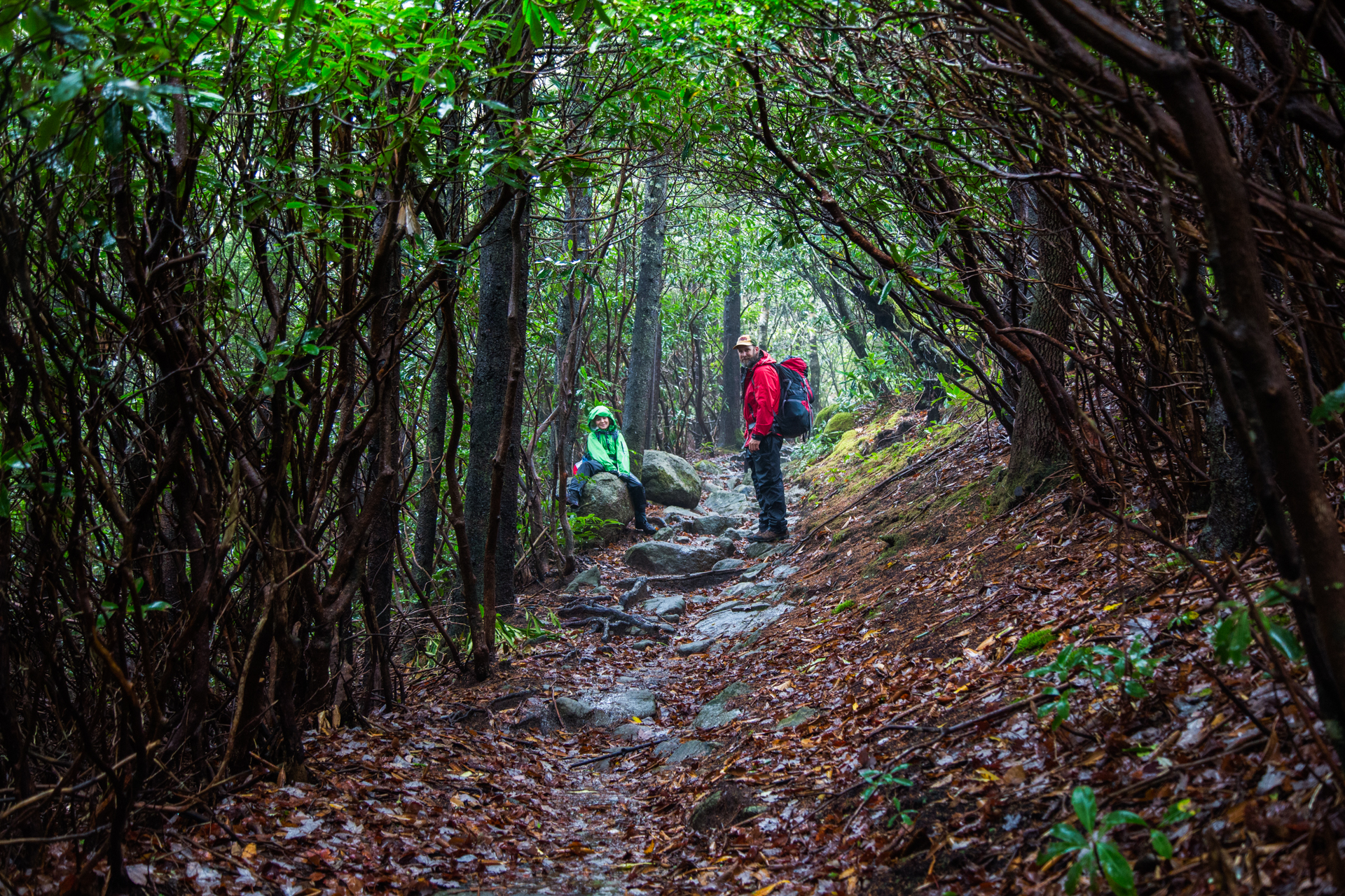 The next morning, we awoke to the sounds of our bunkmates preparing to depart, and looked out to see the same steady rain that lulled us off the dreamland the night before. After a quick breakfast, we donned our rain gear and backpacks and hit the trail, eager for more of the breathtaking scenery along the AT. The trees were completely bare along the ridge which at first was heartbreaking, because after all, we were here to experience the majesty of fall in the Smokey Mountains. However, the naked trees coupled with our high vantage point allowed us incredible views of the entire mountain range in places that ordinarily would have been a tunnel of foliage. We gazed across endless valleys, blanketed in autumn hues completely awestruck with the broad spectrum that spread out before us. Well before we were ready, we reached the junction leading us down a valley to our second camp.