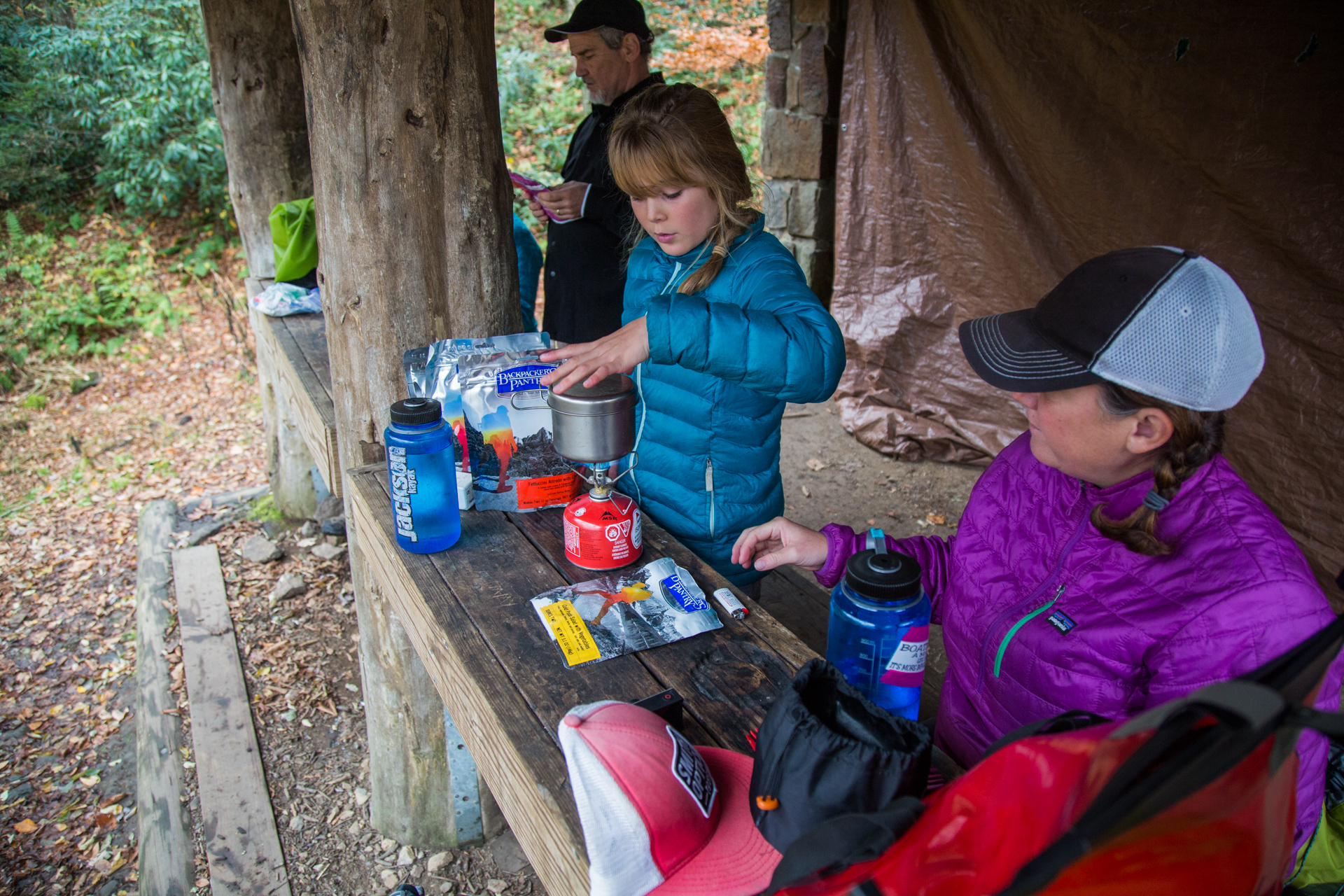Abby cooking a dehydrated feast of salmon pesto pasta and creme brulee on the front porch of the shelter.