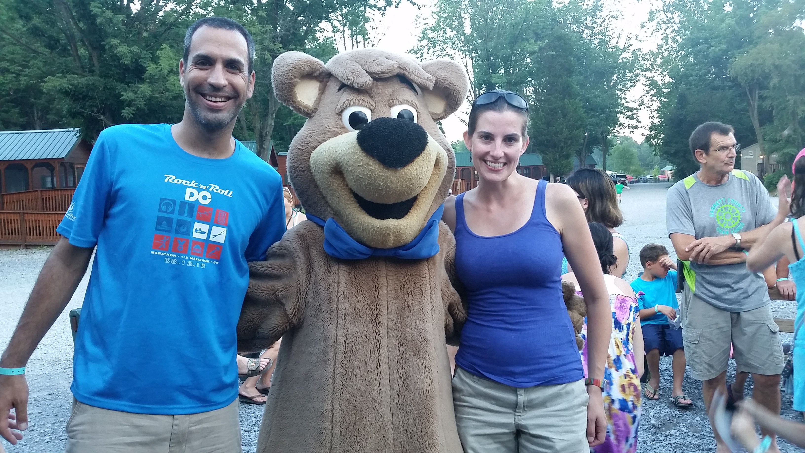 You probably shouldn't spend the hottest weekend of the year outdoors in the sun. But if you're gonna, a water park with periodic access to air conditioning is just about perfect. We swam in a couple of pools, shot each other with water cannons and went multiple rounds down a big, twisty water slide. (Yes, the kids enjoyed themselves too.) Jellystone publishes a week-long list of activities in advance, hour by hour, so you're never without options if you want to go do something. There was a flashlight treasure hunt one night and a dance party with Yogi, Cindy and Boo Boo the next. Side note: we felt bad for the actors stuffed into furry costumes on such a hot day. And XY and her friend are terrified of mascots. But Lindy and I couldn't resist a picture with a bear.