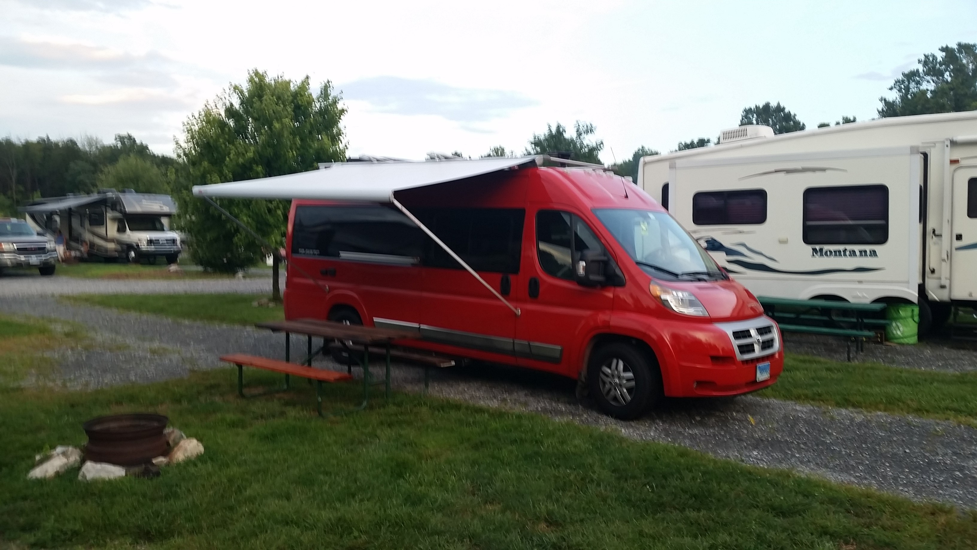 We had to commit a little campsite subterfuge to get our spot. The fifth-wheelers booked first. When we went to the website to book, we entered Roxanne's measurements and were given a site on the opposite side of the park. That wouldn't do for two families sharing meals. So we tried again in case it was some sort of error. Nope. Third try: we decided to say we were bringing a fifth-wheel that's 39 feet long. Lo and behold, we got the spot right next to our friends. I felt bad about this, because I figured I was blocking a large RV from the only type of site that would hold it. But when we arrived, we saw several other Class B vans and even a cluster of tents on one site right nearby. No big deal.