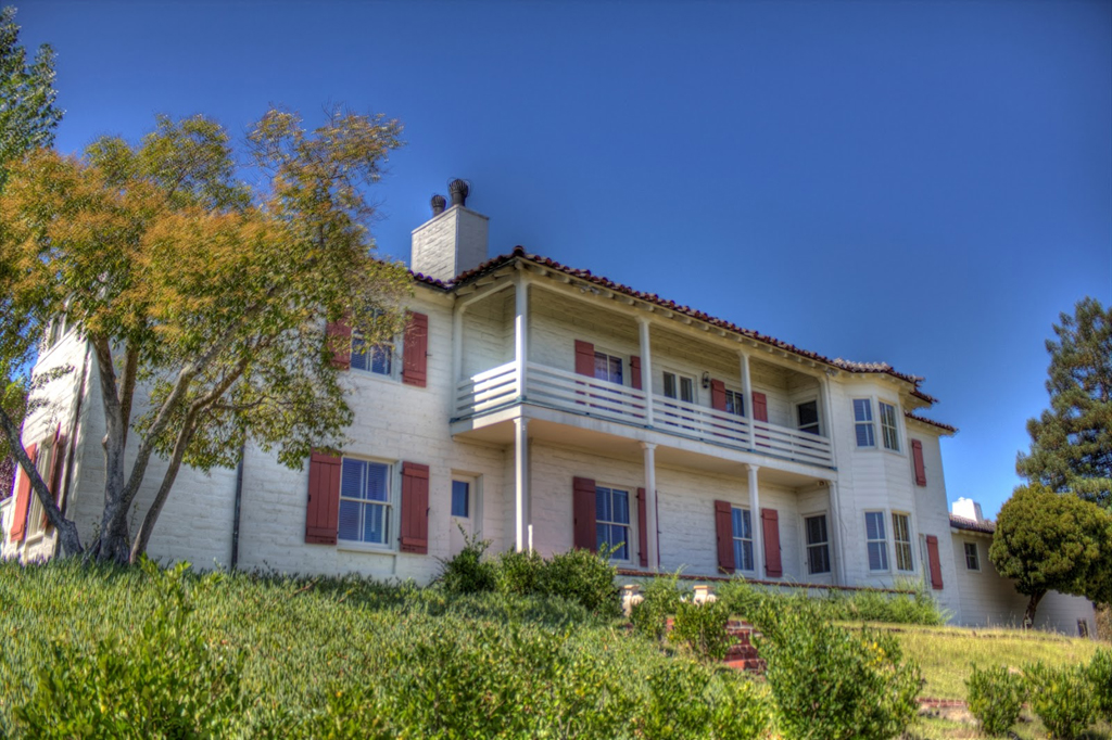 Eugene O'Neill's Tao House which has a white brick exterior with red shutters.Eugene O'Neill's Tao House