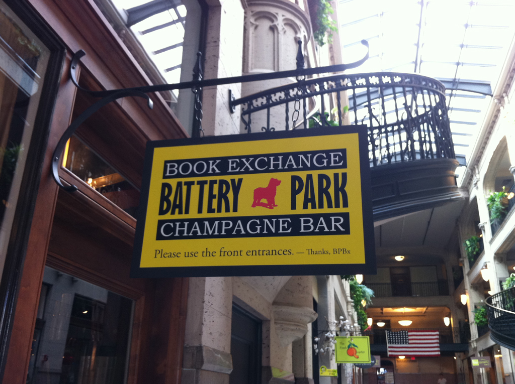 Sign for Battery Park Book Exchange & Champagne Bar.Battery Park Book Exchange & Champagne Bar