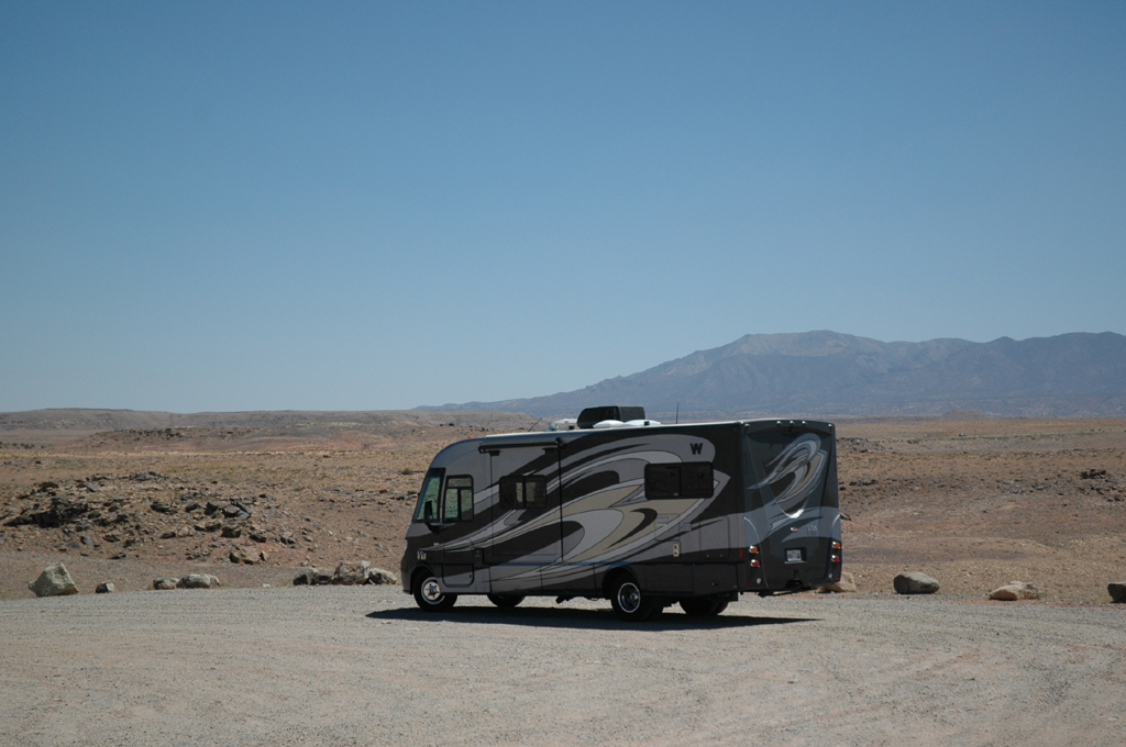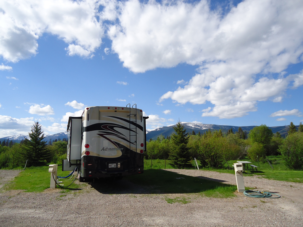 Winnebago Adventurer parked in campsite with a view of the mountains ahead.
