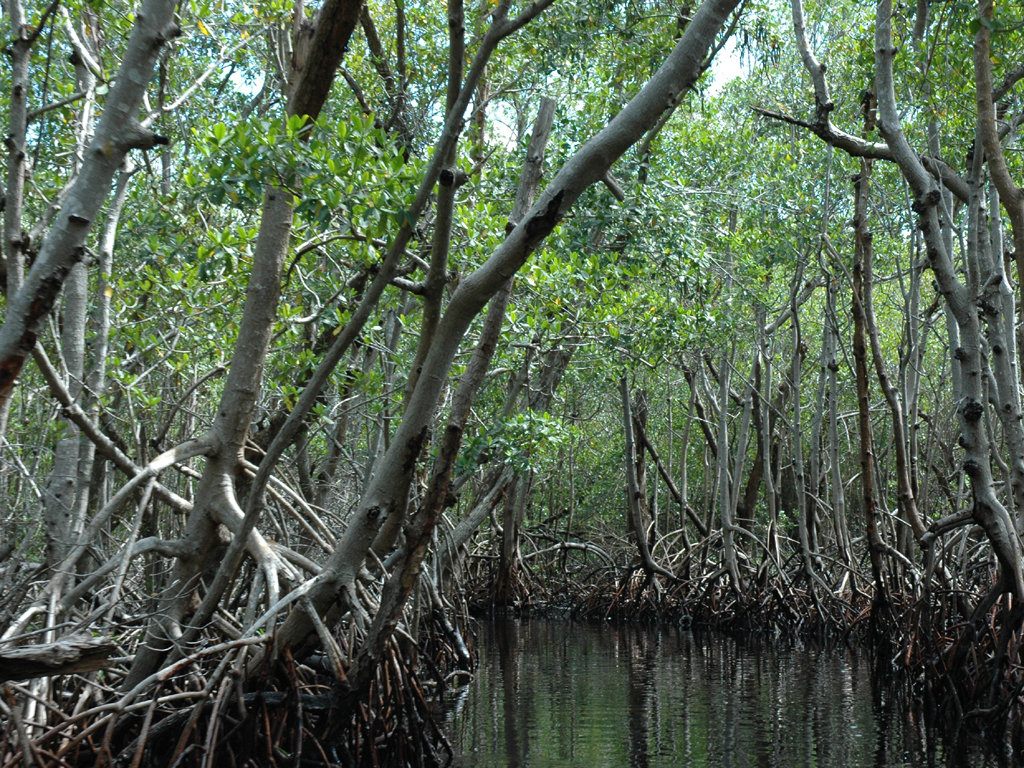 Narrow pathway of water through the dense trees of the Everglades.