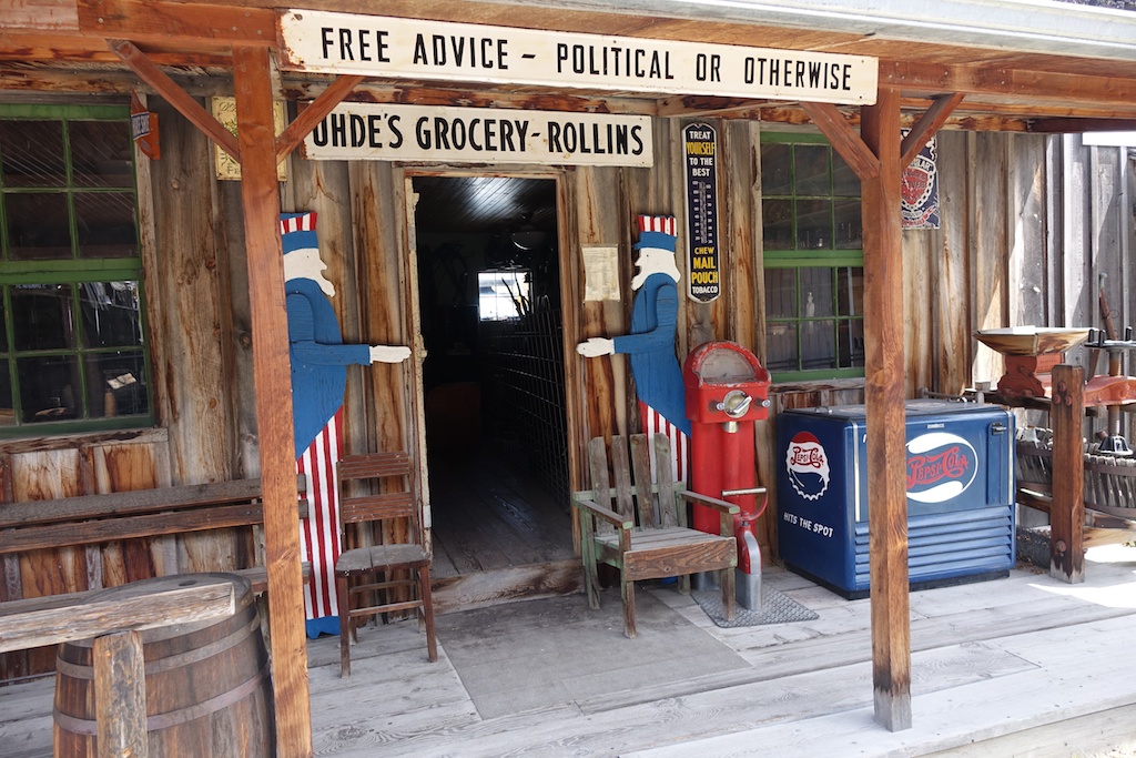 Old wooden store front with sign reading, "Uhde's Grocery - Rollins."