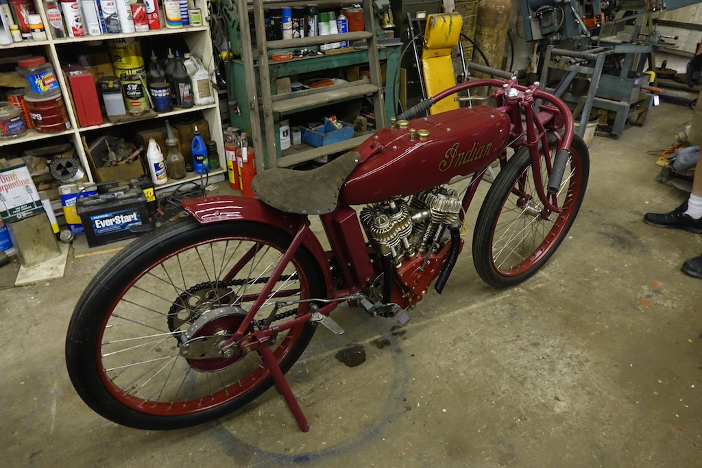 We're now far back in the machine shop which, as a non-display area, rises to an even higher level of dishevelment. Almost theatrically, as if in a mechanical forest clearing surrounded by thickets of wrenches and dusty drill presses, the Indian sits. It's been nearly restored to its original form and even in the dim fluorescent light seems to burn a warm red. Gil clearly wants to show his latest prize off and takes a couple of hard pushes at the rear wheel in an attempt to bring the bike to life. It almost catches, but his sore rotator cuffs limit his ability to get the dully polished engine to fire.