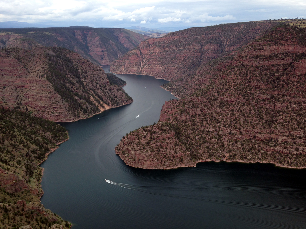 Flaming Gorge Dam, rising 502 feet high, impounds the waters of the Green River. It was that river that John Wesley Powell was exploring in 1869 when he and nine men in small wooden boats came upon the region. They saw the sun reflecting off the red rocks. Hence the name. The dam is pretty dam impressive, but I always prefer the view of the reservoir that it creates.