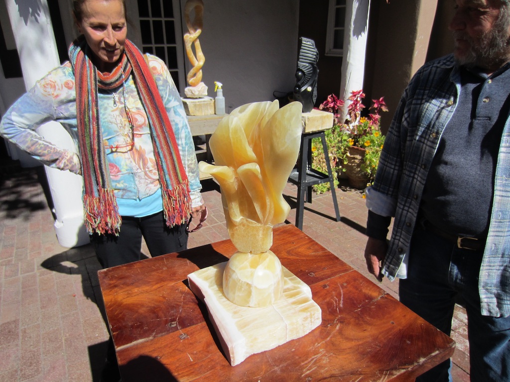 Terry admires an alabaster sculpture as the artist explains his delicate carving technique.