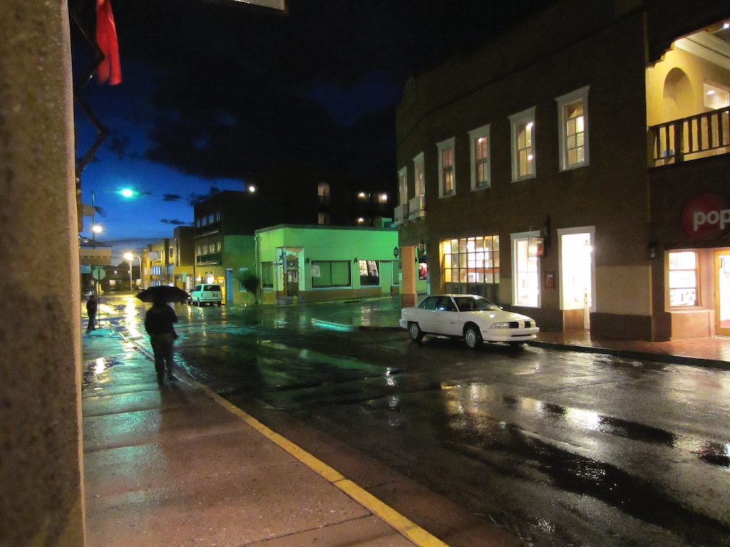 The Santa Fe streets are washed clean outside of the Coyote Cafe by a brief evening thunderstorm.