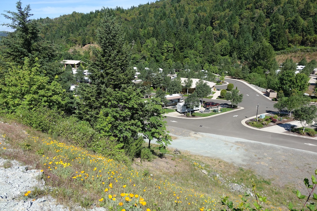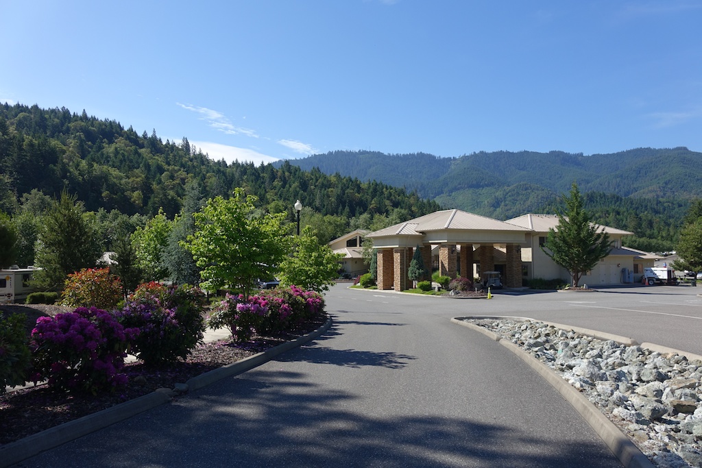Canyonville is off I-5 about 100 miles south of Eugene. To most travelers chugging past at 65 MPH, it would appear to be a small town with an Indian-owned casino and truck stop. But, if you exit and drive past the truck stop and curve slightly south behind it, you are met with a finely manicured small boulevard that enters the impeccably landscaped Seven Feathers RV Resort.