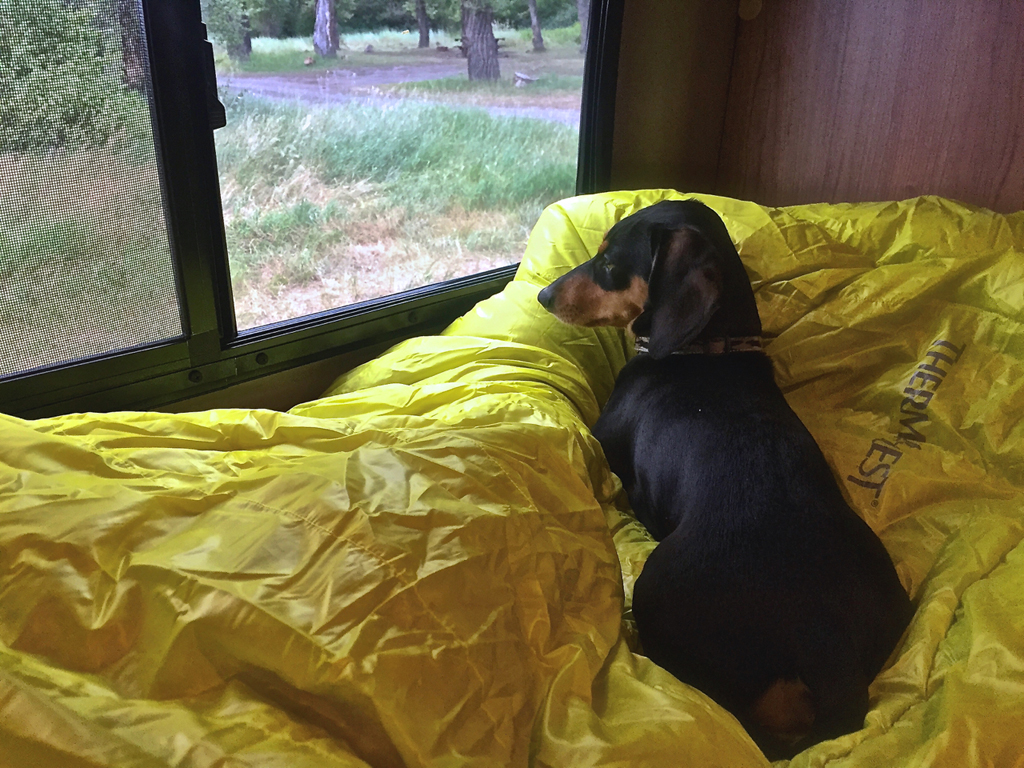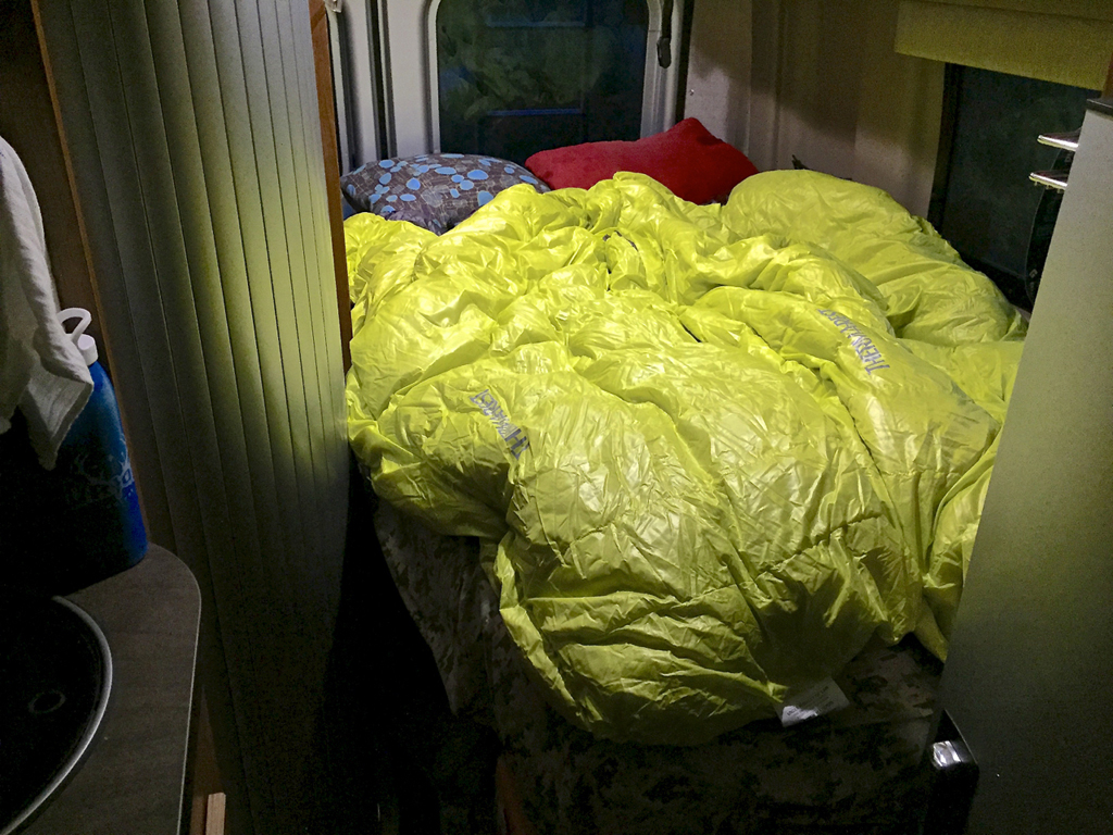 We've really fallen in love with the Auriga down blankets from Therm-a-rest. Think of them as half of a down sleeping bag -- they are basically meant to be used alone like a down comforter, or they can be paired with an inflatable Therm-a-rest sleeping pad, and used in your tent on the trail, utilizing the pad to insulate your back. They are very warm, highly compressible, light, and keep us warm in a variety of conditions. We keep them stored in the Travato overhead storage bin, or just leave them on the bed when we fold it up. Weighing just over a pound, they then serve double duty if we camp a night away from the Travato, easily packing into backpacks, preventing us from needing to store extra sleeping bags to take with us on the trail. As an active, tossing sleeper, I can still move around a lot just like I would at home or in the Travato. Tripper loves to call them home too.