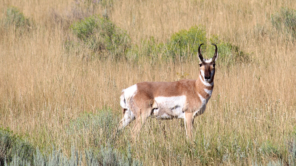 Pronghorn antelope standing in field of tall grass.