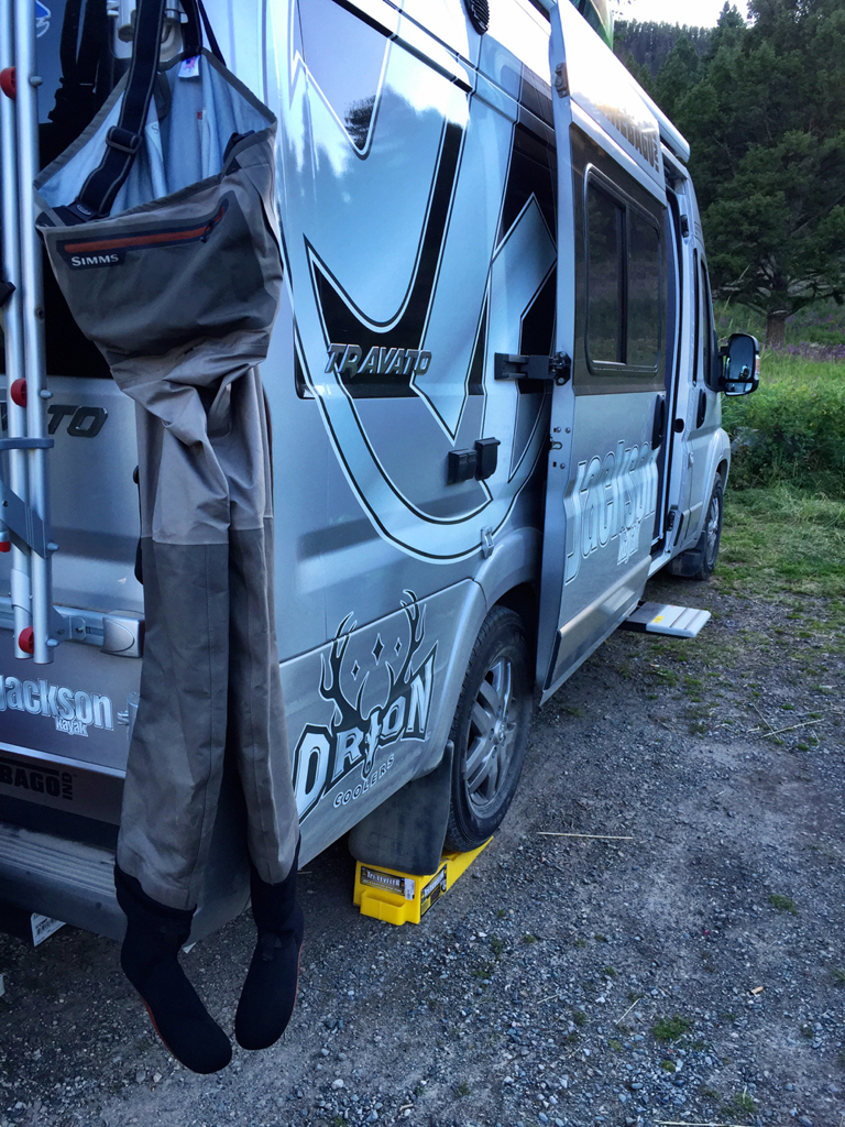 Winnebago Travato parked with Simms fishing waders handing from the backend.