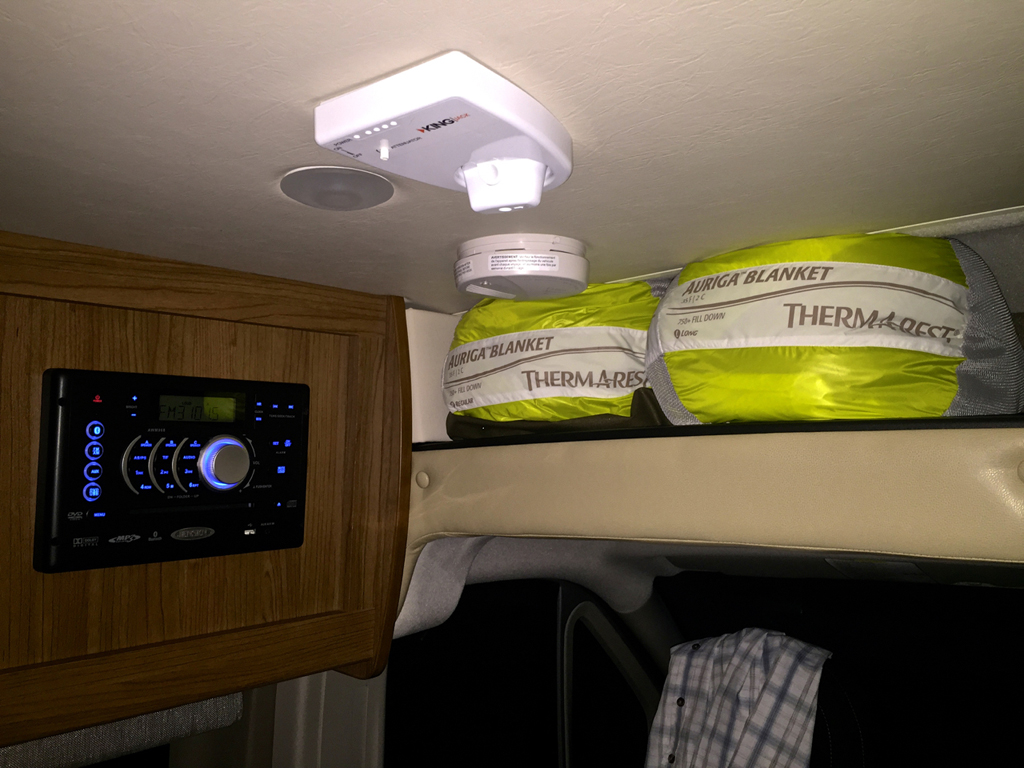 Two Therm-a-Rest Auriga Down Blankets in storage area above the driver's seat.